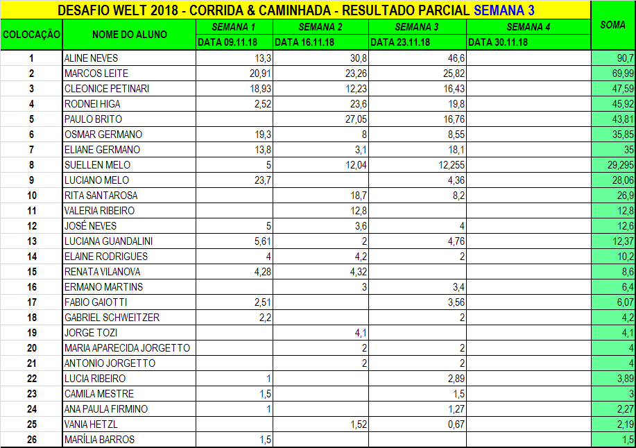 RESULTADO PARCIAL - 3ª SEMANA- DESAFIO WELT